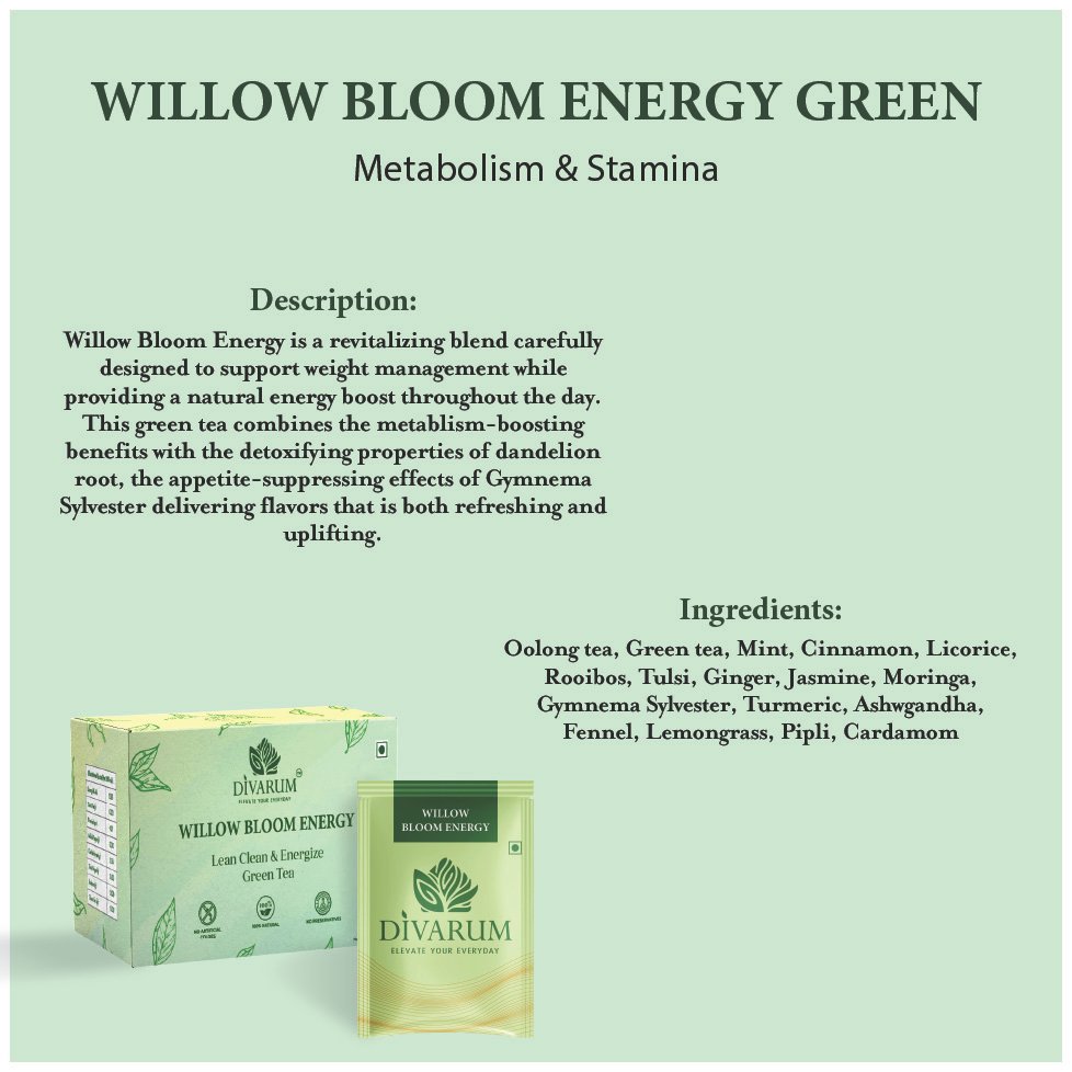 Willow Bloom Energy is a revitalizing weight loss green tea designed to support energy, metabolism, and overall wellness. This carefully crafted blend combines green tea with powerful herbs and spices to create a refreshing and uplifting daily ritual.