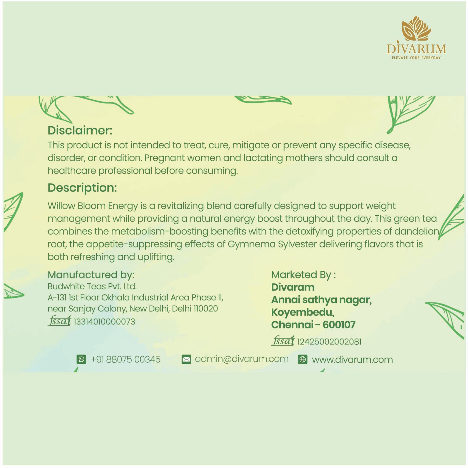 Willow Bloom Energy offers a light and refreshing taste. Mint and lemongrass bring freshness, while spices like cinnamon and cardamom add warmth and depth.